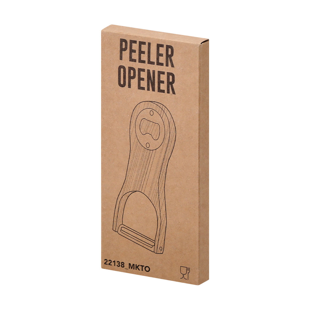 Pelador abridor fabricado en Bambú. En la parte inferior es un práctico y funcional pelador en Acero Inoxidable 420. Y en la parte superior presenta un abridor con acabado metalizado.